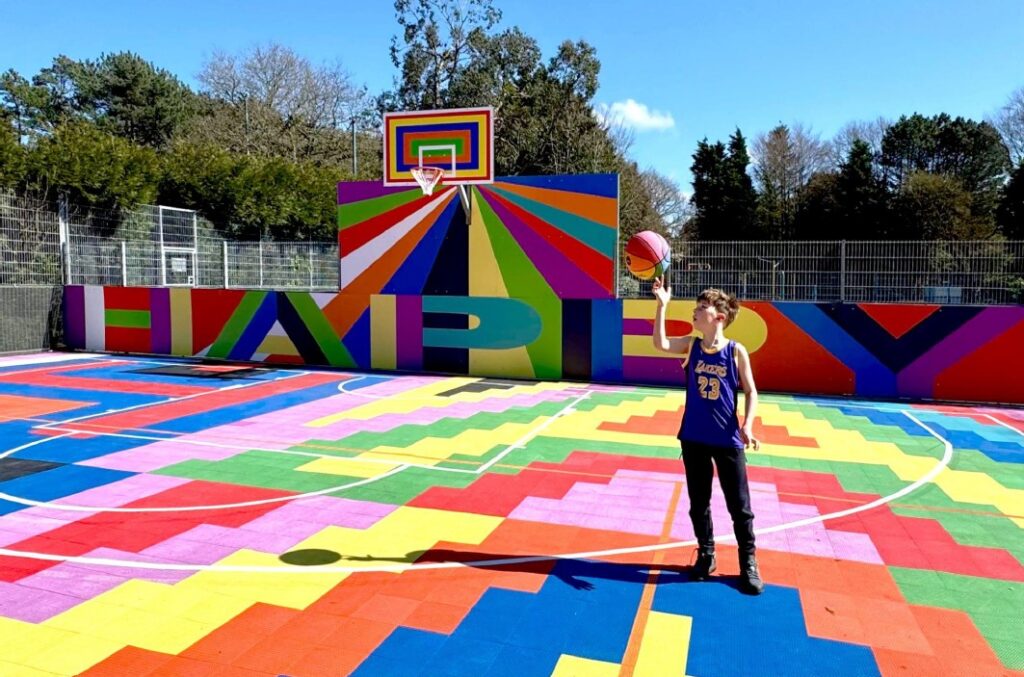 Basketball England says, “We’re excited about the launch of the ‘HA HA HAPPY’ art court in Morecambe – the first of 2026 and just in time for the outdoor basketball