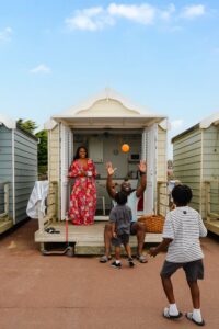 A family have fun at beach huts by the sea